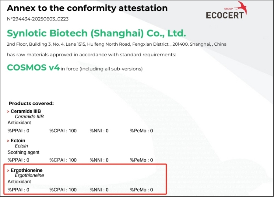 Shanghai Yunluo: Ergothione získal certifikáciu COSMOS
