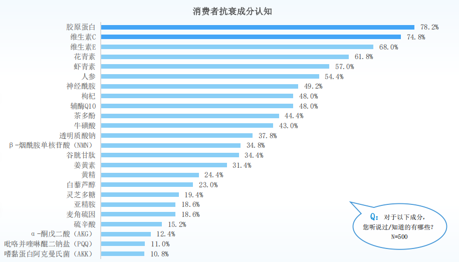 Vďaka vzdelávaniu a rozvoju trhu je kolagén v súčasnosti medzi spotrebiteľmi vysoko uznávanou „zložkou proti starnutiu“. V prieskume o pochopení hlavných zložiek proti starnutiu sú kolagén (78,2 %), vitamín C (74,8 %) a vitamín E (68 %) tri hlavné zložky, ktoré spotrebitelia uznávajú pre orálne výrobky proti starnutiu. Spomedzi 5 najlepších vnímaných zložiek proti starnutiu v rôznych vekových skupinách je kolagén nepochybne „hviezdnou zložkou“.